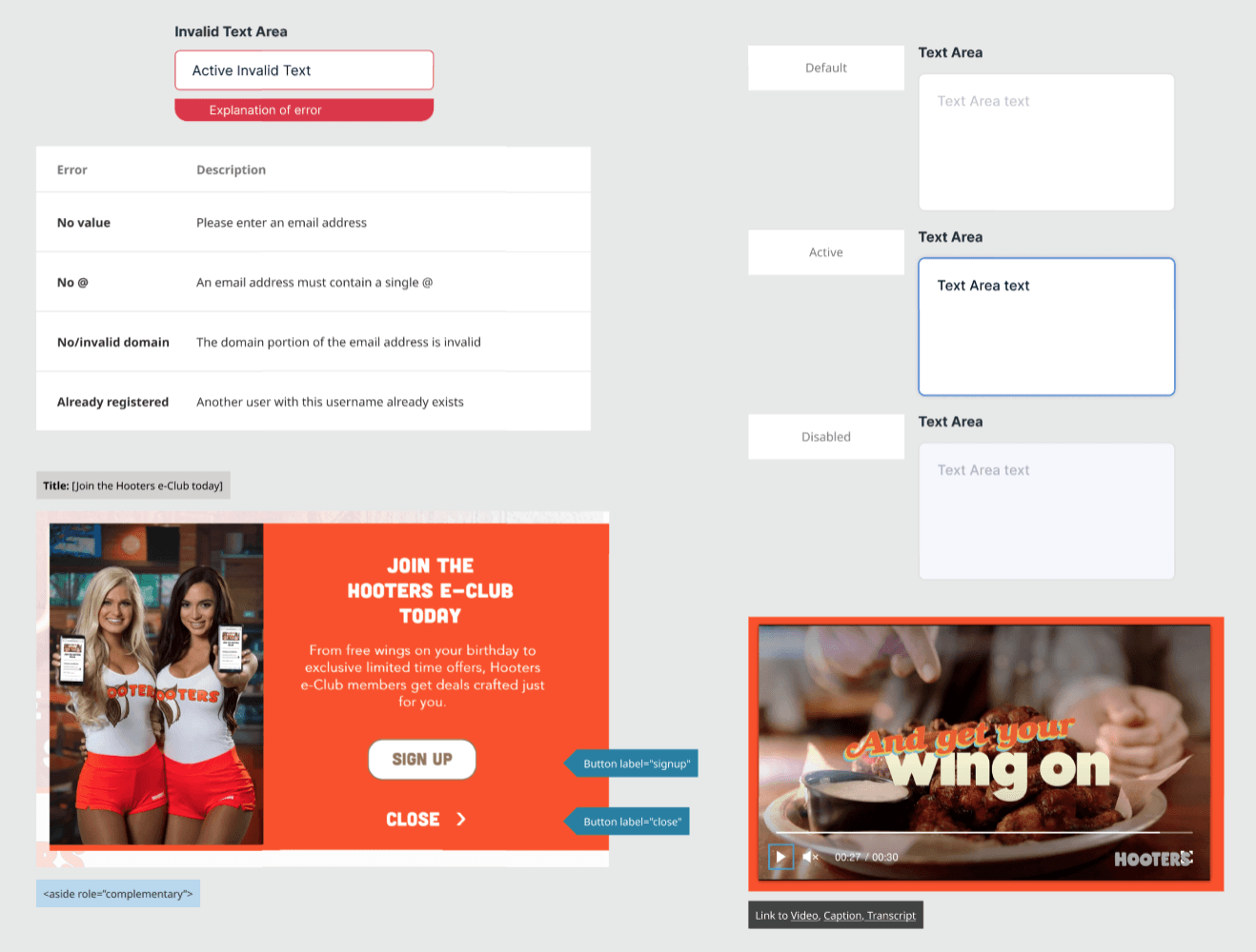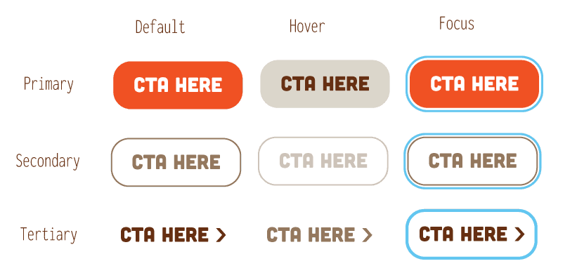 Hooters has a very bold, loud, vibrant orange as a differentiating color. I outlined not only the brand colors and how they show themselves in our various components, but also considered accessibility standards for secondary, and tertiary buttons.